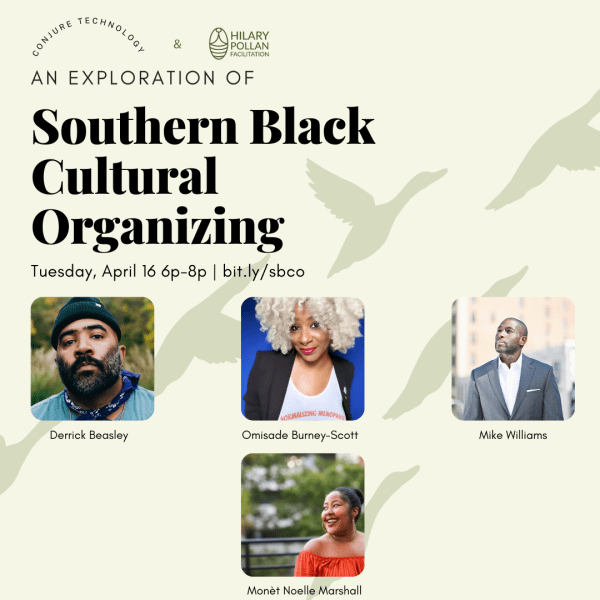 This series came ahead of An Exploration of Southern Cultural Organizing on April 16, 2024. During this participatory event we expanded our collective understanding of cultural organizing through conversation with Triangle NC-based artists and cultural organizers Derrick Beasley, Mike Williams, and Omisade Burney-Scott. There were opportunities to connect and engage with other donors, funders, and cultural organizers, and explore how to engage in a giving relationship to support this transformational work.